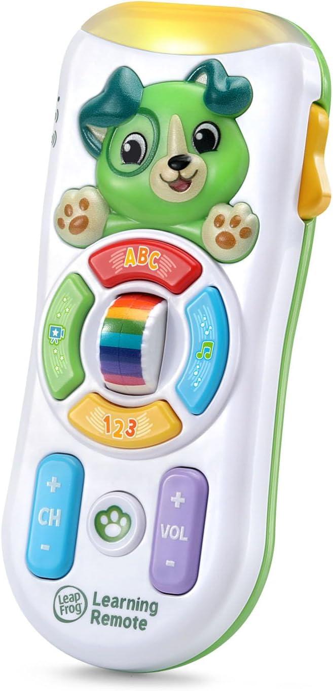 Stream the learning with the Channel Fun Learning Remote! Explore the nine buttons on this role-play remote controller to hear over 100 phrases, sounds and music while building hand strength and coordination. Flip between channels to explore engaging activities that introduce numbers and letters through pretend T.V. shows. Switch to the foreign movies channel to hear common French, Spanish and Mandarin phrases translated into English or listen and dance to salsa, disco and country music on the music channel. Need help to decide what to watch? Press the paw button and tune in to a talk show featuring phrases from your puppy pal. Don't forget to roll the rainbow spinner for a colorful light show and hear color names too! Intended for ages 6+ months. Requires 2 AAA batteries. Batteries included for demo purposes only. New batteries recommended for regular use.