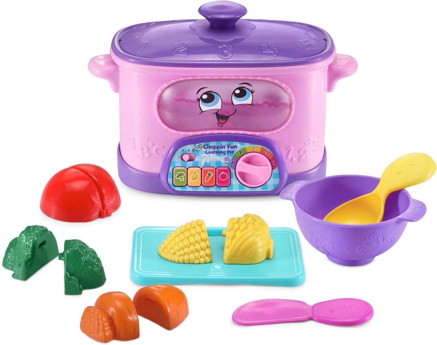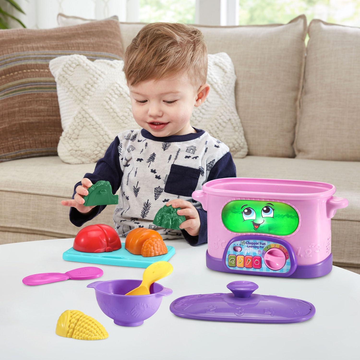 Prepare a recipe for learning with the Choppin’ Fun Learning Pot! Children love to pretend to cook. Prepare broccoli, corn, a tomato and a carrot with snap-apart veggies, a play knife and cutting board. Hear the pot respond with encouraging phrases as kids add veggies to the pot. Let’s make spaghetti sauce! Follow five step-by-step recipes to encourage learning with play. Chop the food and set the temperature dial. Now press a food button and stir the pot to make spaghetti sauce, rainbow soup, corn on the cob, carrot soup and broccoli with cheese! Watch the pot “boil” with pretend water in the front panel. Hear the pot count to 10 and talk about colors as you play. Serve up your creation in the bowl, pick up the spoon, and dig in! All the pieces store in or on the pot for easy cleanup when playtime is done. Soup-tastic! Intended for ages 12+ months. Requires 2 AA batteries. Batteries included for demo purposes only. New batteries recommended for regular use.