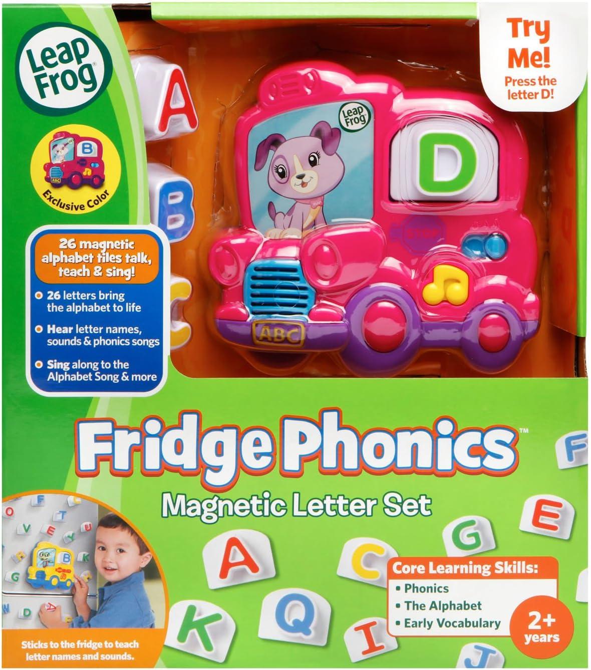 The fridge phonics magnetic letter set – online exclusive Pink brings phonics skills to life with 26 singing, talking letters. Perfect for keeping little ones busy learning, the magnetic school bus and letter tiles stick to your fridge or any magnetic surface. Children can place each letter into the bus window and press it to hear Violet say the letter's name and sound. Press it twice and violet will say a word that begins with the letter and then use the word In a sentence. Children can also press the music note to move and sing along to three learning songs, including the “alphabet song” And “wheels on the bus. ” designed by LeapFrog experts for children between 2-5 years old, fridge phonics reinforces alphabet knowledge, including Letter names and sounds, which is an important first step in learning to read. Playing with the letter tiles, which are designed for easy manipulation by little hands, also helps strengthen fine motor and coordination skills.