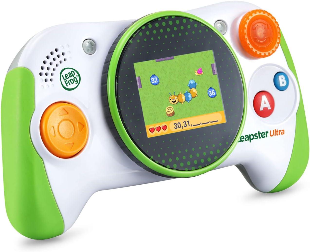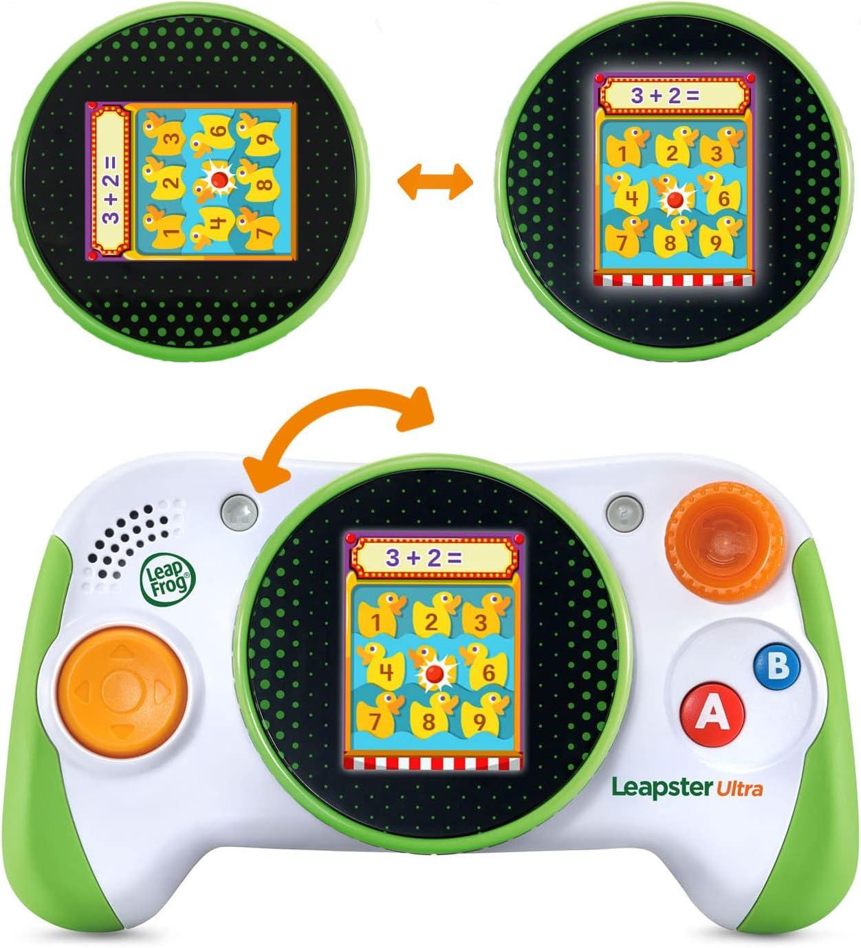 Experience an island of excitement in your hands with the Leapster Ultra. Welcome to LeapFriends Island, a colorful place where kids can discover and play more than 30 bite-sized games with 1,200+ learning challenges that explore preschool and kindergarten skills like spelling, counting, phonics and problem-solving. No internet connection, downloads or account setup required. Go to places like the farm, airport and fire station to encounter more than 20 LeapFriends. Join playful characters like Gertie the goat and help her jump to words that start with the letter G to explore letters and letter sounds! Spend some time with Nom-Nom, the berry-loving friend that only eats an even number of berries and build a foundation for early math concepts. Shaped like grown-up controllers, the Leapster Ultra is easy to use and has a bonus spinner and rotating screen that add unique ways to play. Games include three skill levels to keep kids challenged and minds growing. Save game progress with two-player profiles. Intended for ages 4+ years. Requires 4 AA batteries. Batteries included for demo purposes only. New batteries recommended for regular use.