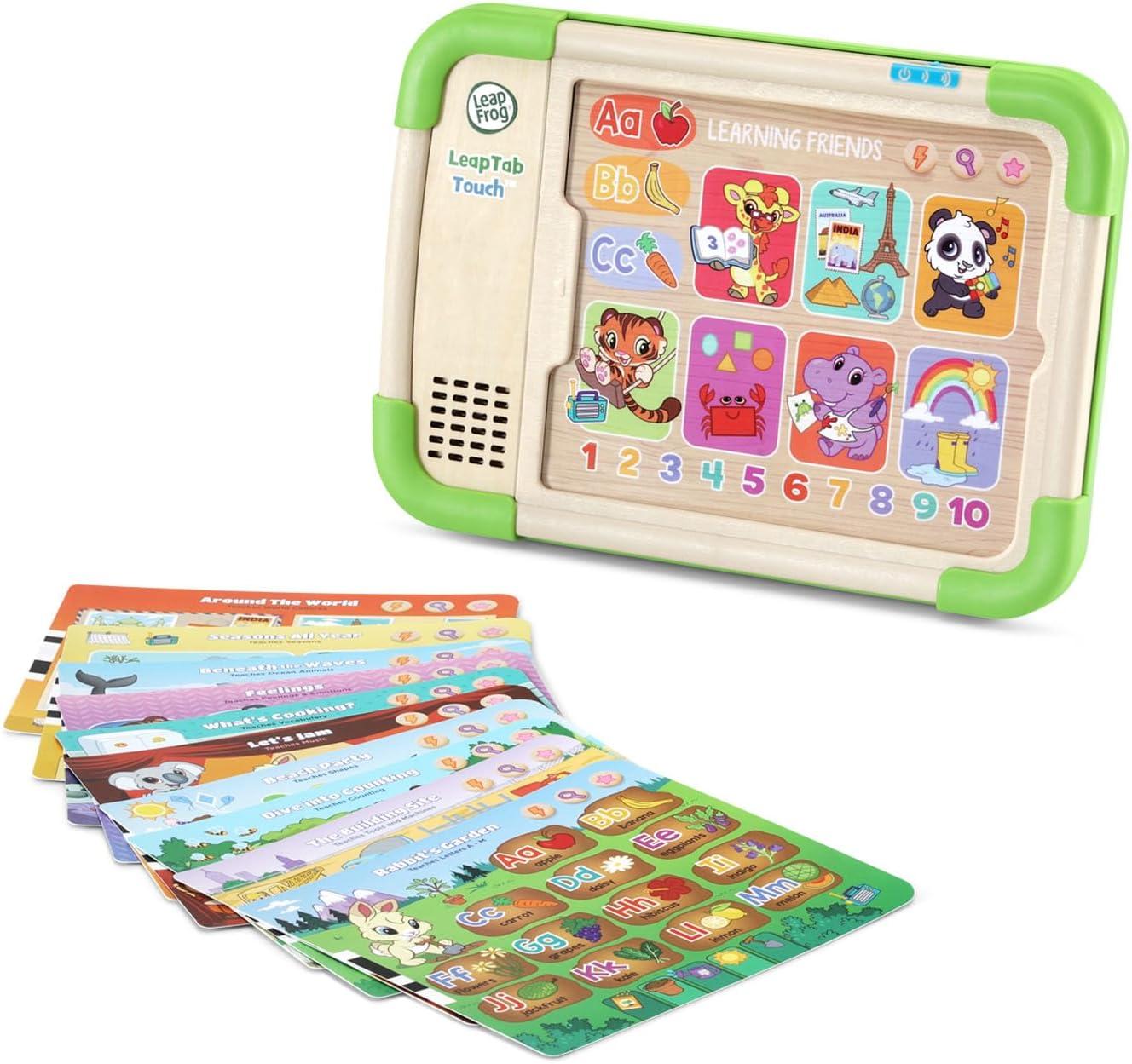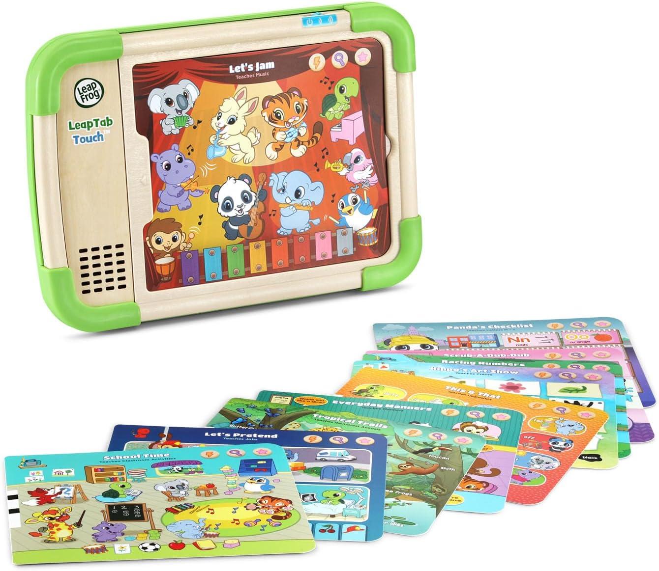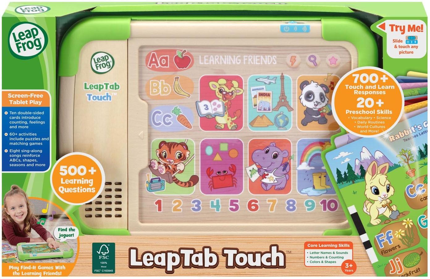 New skills are at your preschooler’s fingertips with the screen-free LeapTab Touch™. Animal friends grab their attention and introduce kids to tons of subjects they’ll explore in school on 10 double-sided cards. Tap the hundreds of touch-to-learn spots on the sturdy, colorful touch pages to play activities, games and puzzles. Activities encourage kids to learn about preschool skills from letters and number to manners and feelings. Look for cards with a radio touch spot on them to play eight sing-along songs that explore what to wear for the weather, daily routines and more. Clean-up and storage are simple with a built-in card holder that keeps pages together while playing and locks them in place to keep them from falling out. This product is made with 100% FSC-certified wood that comes from well-managed forests. Intended for ages 3+ years. Requires 2 AA batteries. Batteries included for demo purposes only. New batteries recommended for regular use.