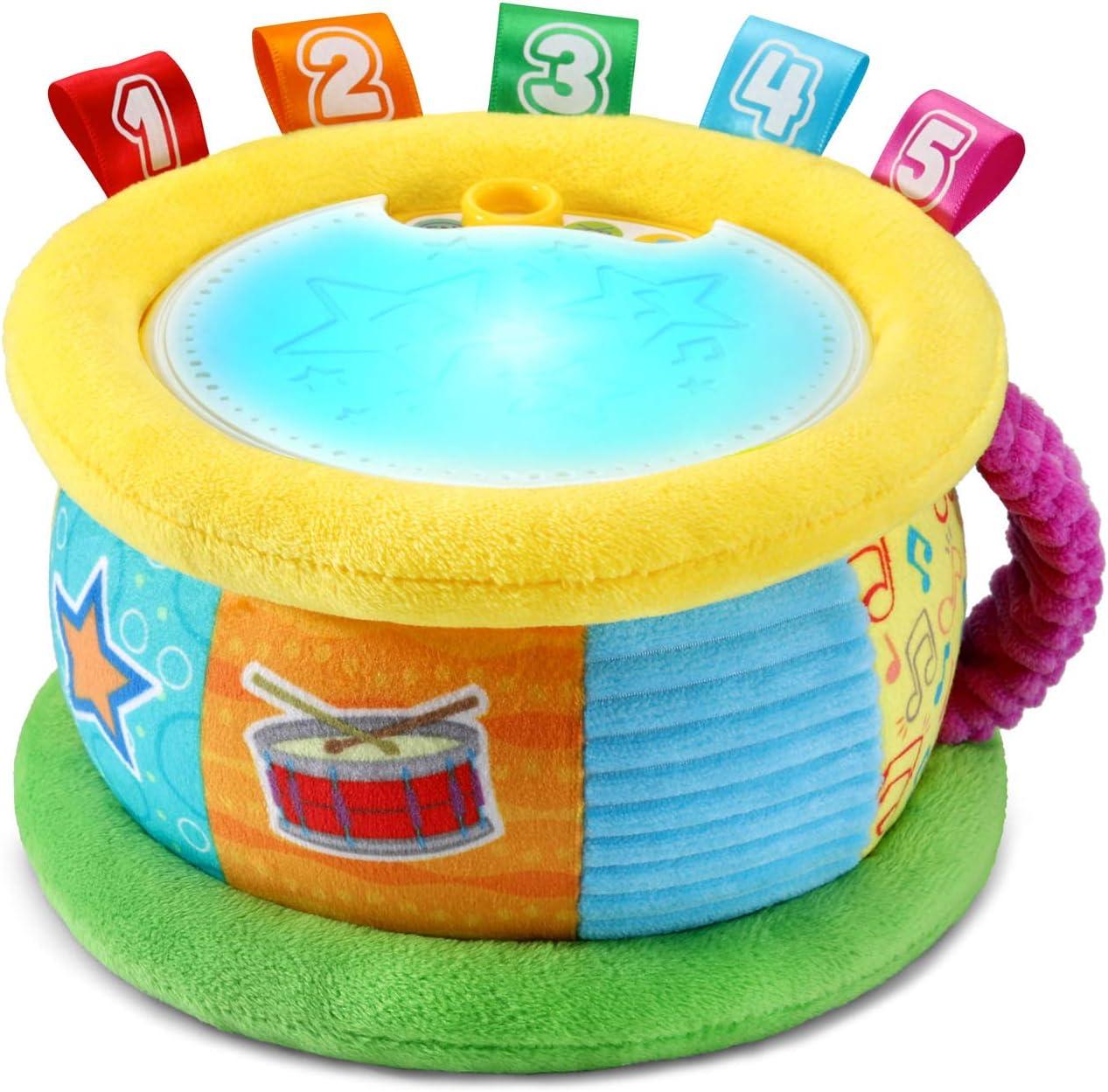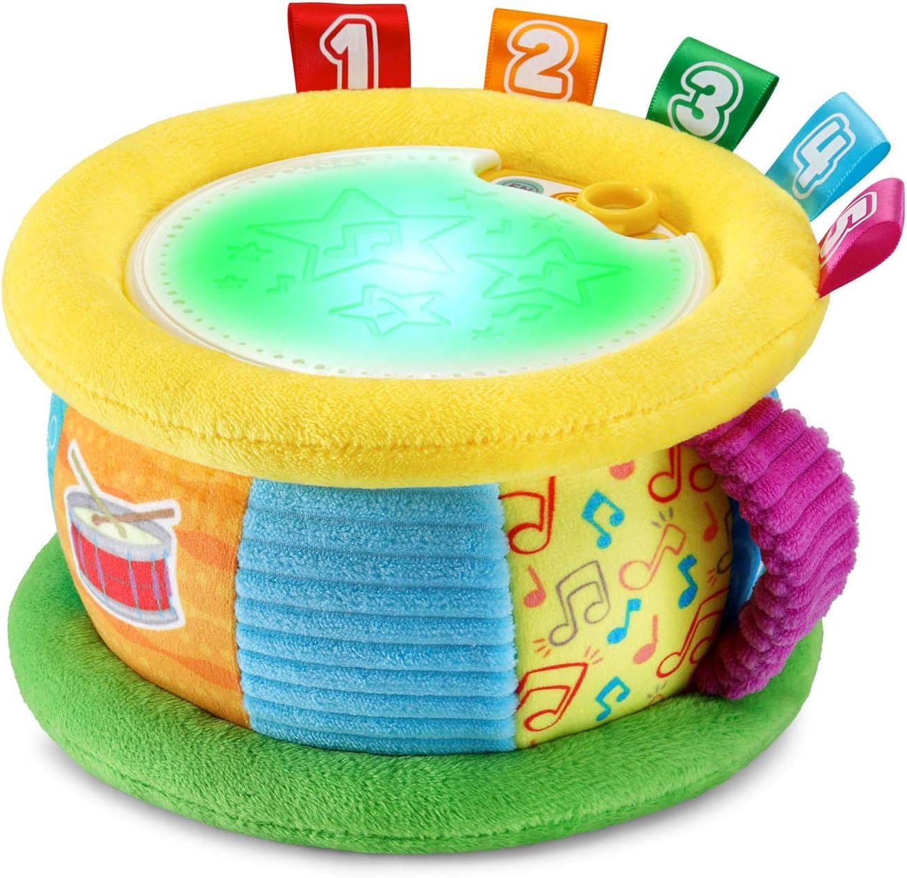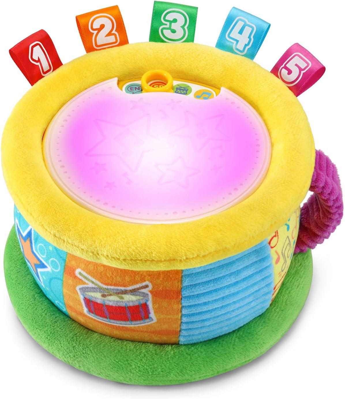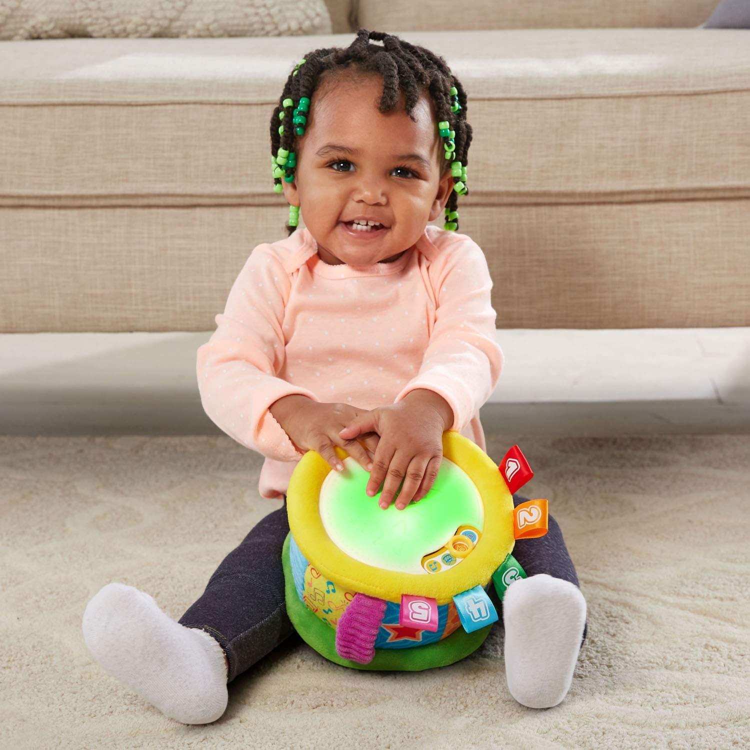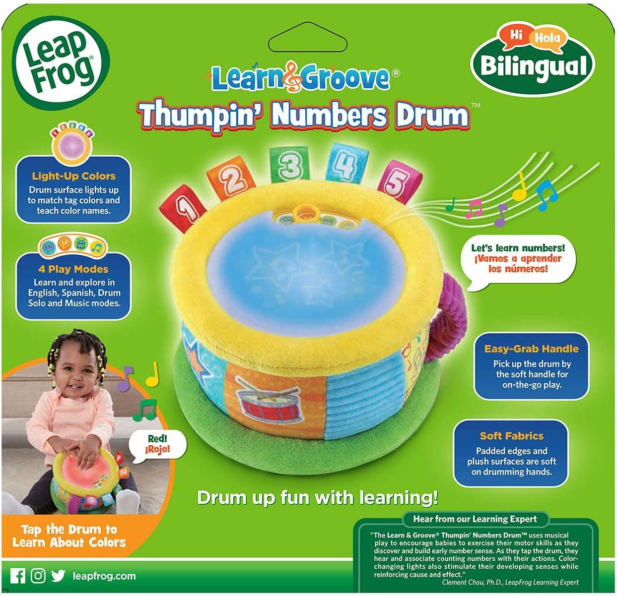 Count to the beat of your own drum with the Learn and Groove Thumpin’ Numbers Drum. Tap the top of the drum and it will light up to match the numbered tags' colors while saying the color’s name or counting 1-10. Choose English or Spanish modes to learn about colors and numbers in both English and Spanish. Drum up your own beat in Drum Solo mode to add to reggae, pop and Latin music styles. In Music mode, jam along to 12 children’s melodies. This plush drum is designed with textured fabric with colorful, numbered tags that add to sensory development and encourage touch. Take the show on the road using the easy-grab fabric handle for on-the-go play. Intended for ages 6+ months. Requires 2 AA batteries. Batteries included for demo purposes only. New batteries recommended for regular use.
