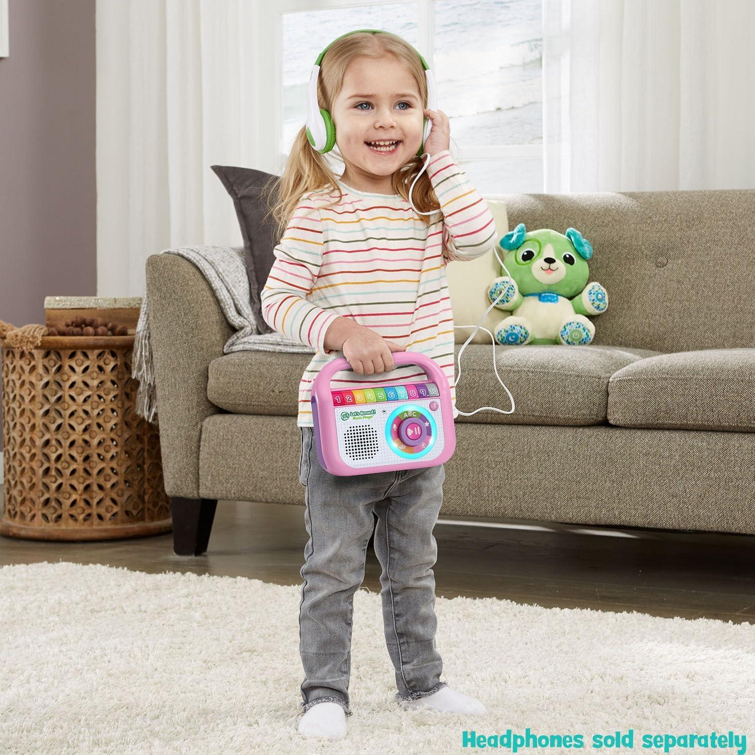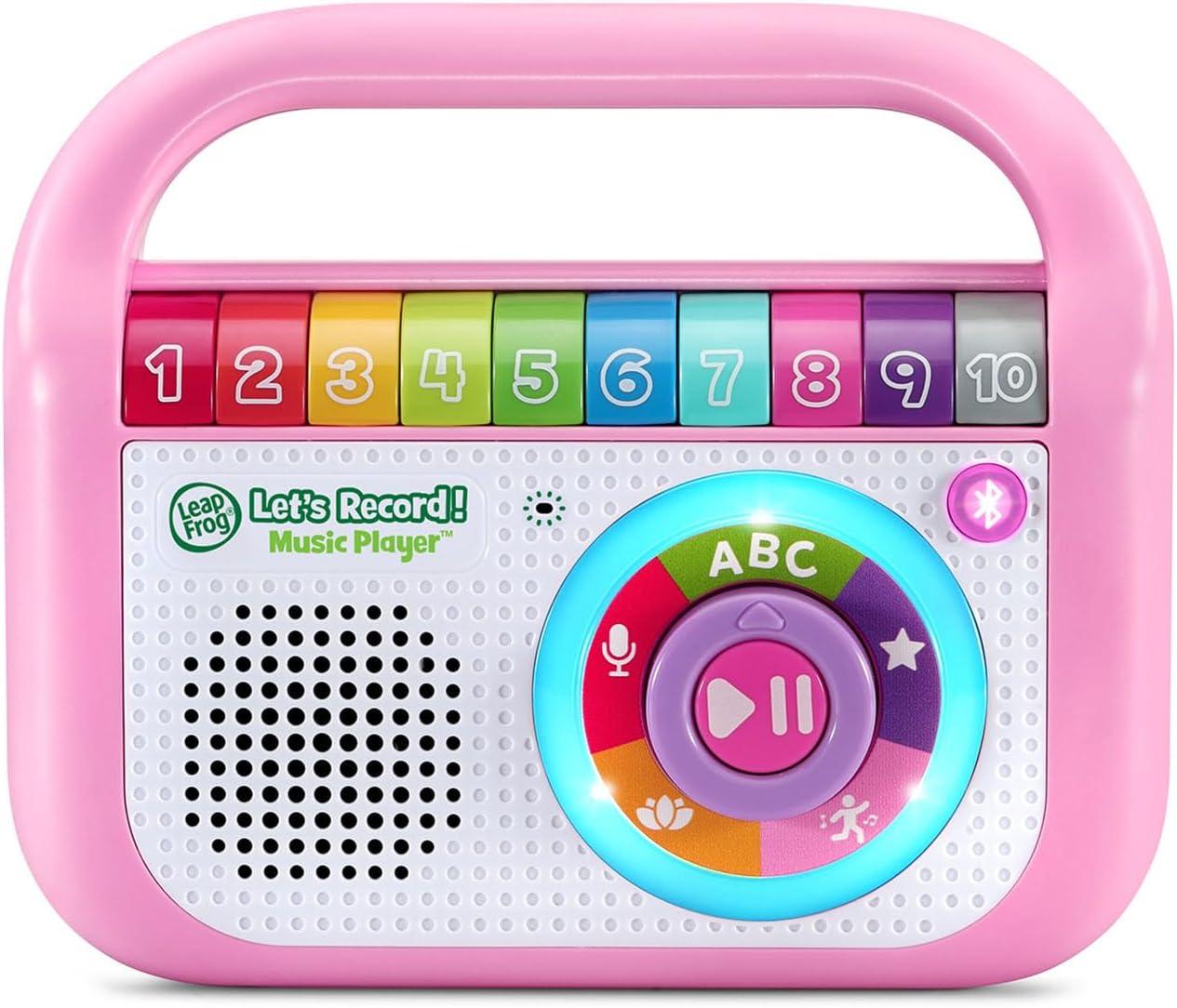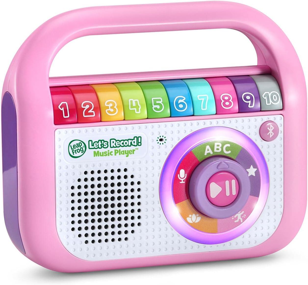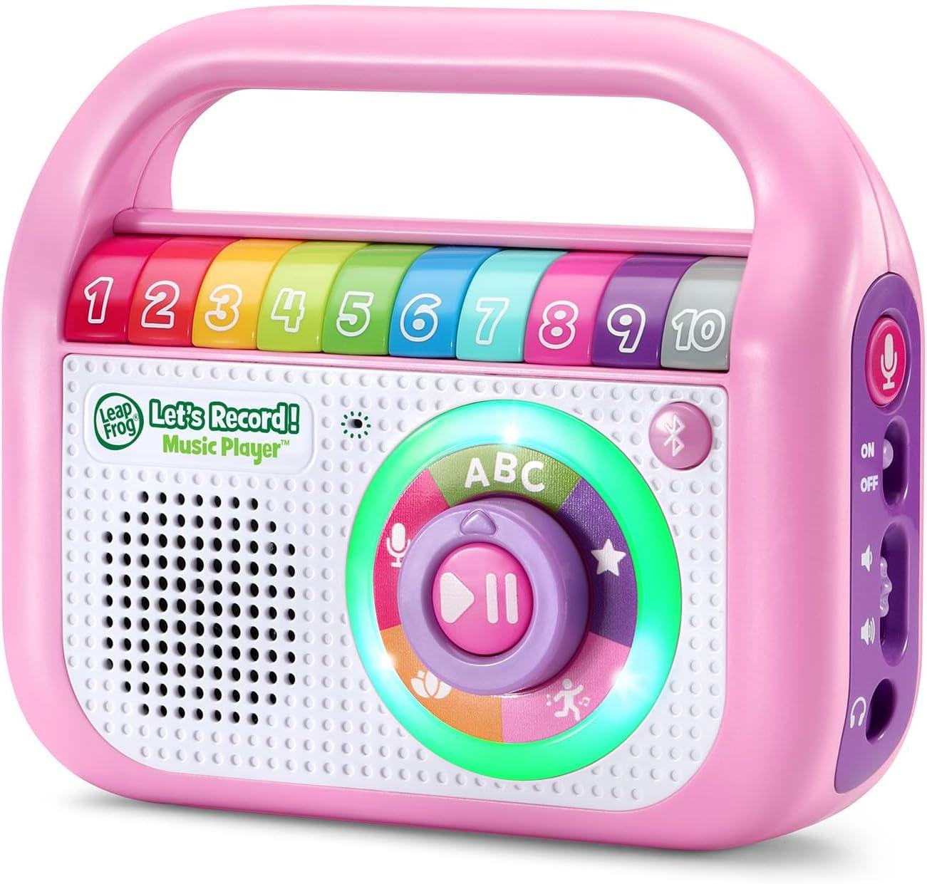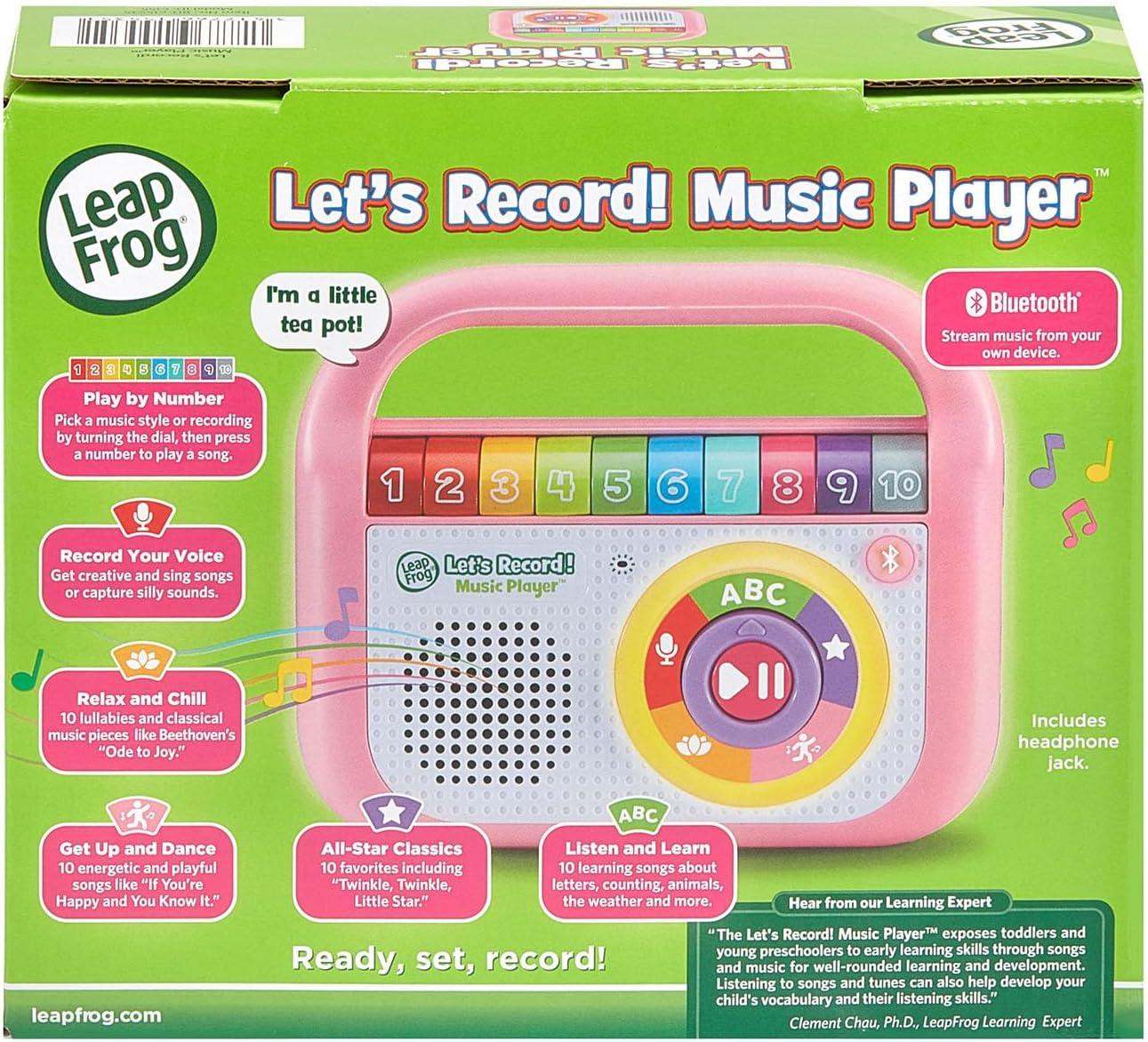Turn on the tunes and play up the learning with the Let's Record! Music Player. Your budding singer can record up to thirty minutes of their voice or silly sounds! Ten learning songs teach kids about letters, counting, animals, the weather and more. When it's time to get up and get active, switch to 10 energetic songs like “If You're Happy and You Know It”! Encourage kids to sing along to 10 classic favorites like “Twinkle, Twinkle, Little Star,” then relax with 10 lullabies and classical music pieces like Beethoven’s “Ode to Joy.” With Bluetooth wireless technology, adults can stream music from their own devices to add songs and soundscapes to the included 40 songs. Introduce your favorite toddlers and preschoolers to a world of music and learning! Intended for ages 18+ months. Requires 4 AA batteries. Batteries included for demo purposes only. New batteries recommended for regular use.