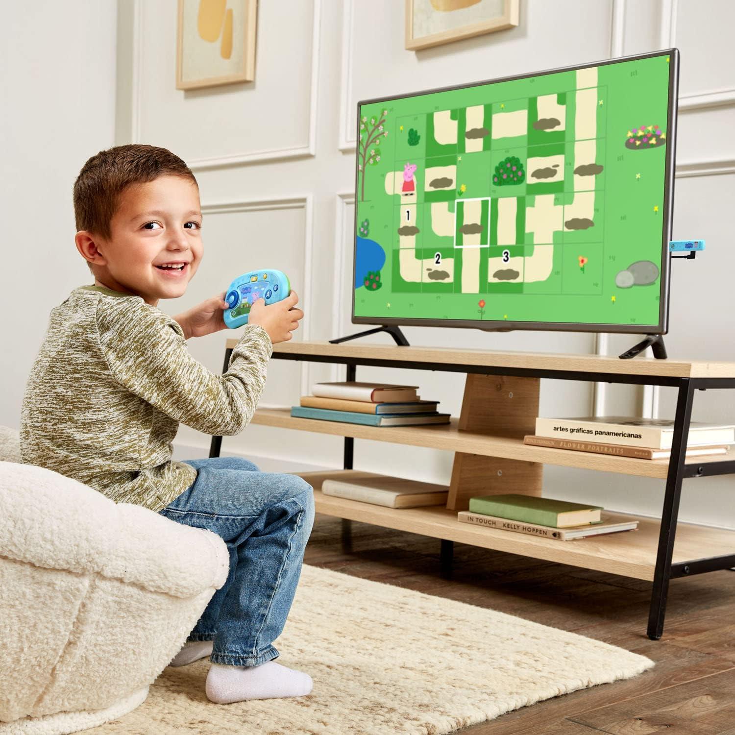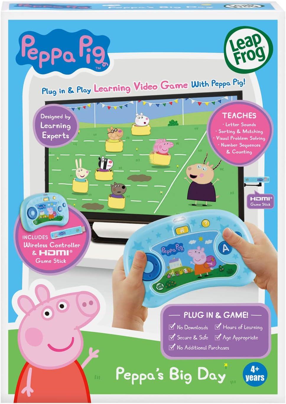 Get ready for a fun-filled day of muddy puddles and more with the Peppa Pig Peppa’s Big Day video game. Plug in and play eight games with Peppa Pig using the wireless controller. No web connection, downloads or account setup required. Join Peppa Pig for an oinktastic day at home, playgroup and on a field trip. Little piggies will be excited to help Peppa Pig count ingredients for recipes with Mummy and Daddy Pig or help her sort items to clean her messy room. Preschoolers can then go to playgroup with Peppa Pig to explore rhymes and play a game of freeze dance. Go on a field trip and help her compete in a sack race by matching colors, shapes and letters or discover letter sounds and select the correct target to practice archery. Play the games again and again from the Quick Play menu. Save unique game progress with up to five player profiles so the whole family can play. Intended for ages 4+ years. Requires 2 AA batteries. Batteries not included.