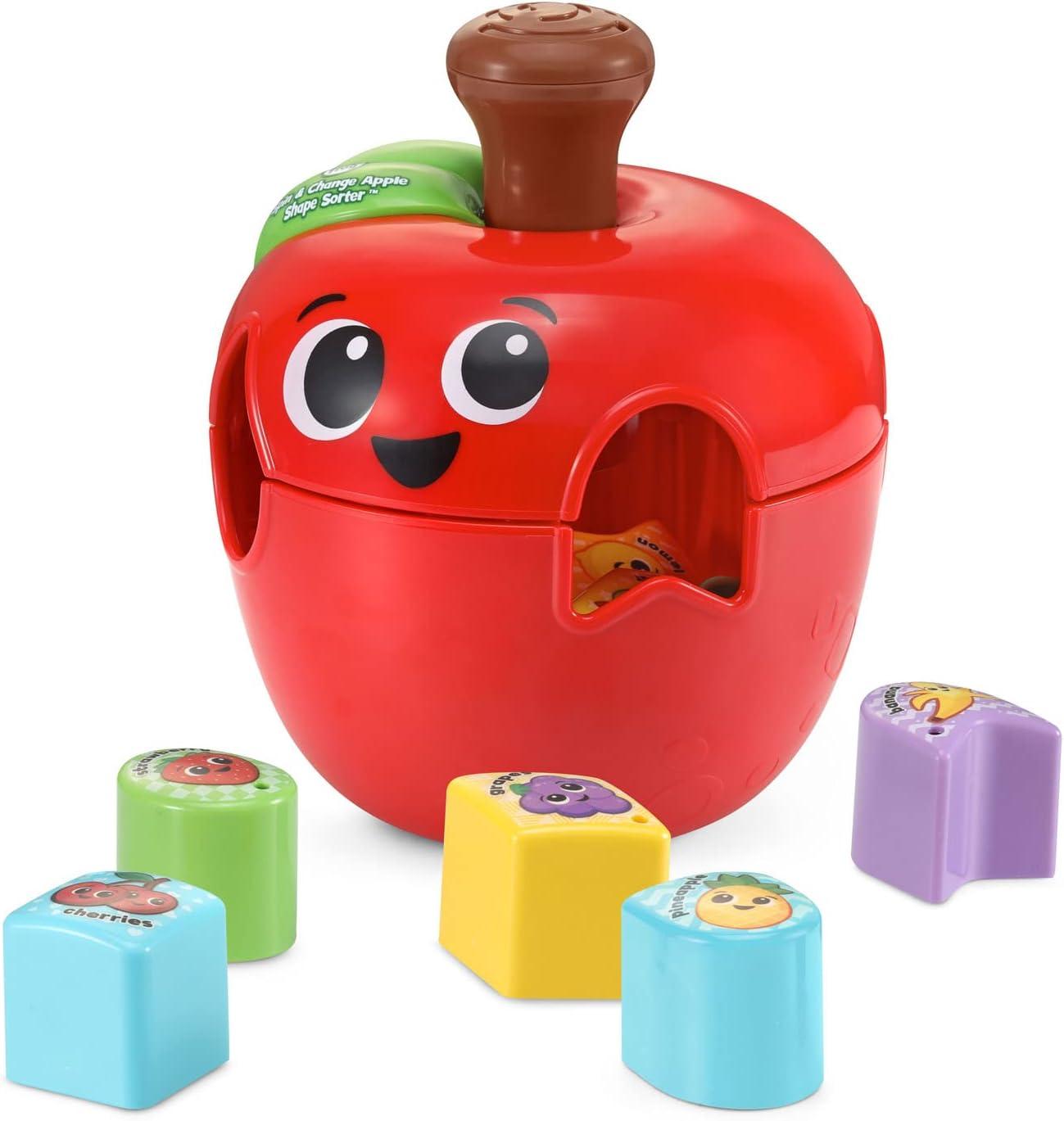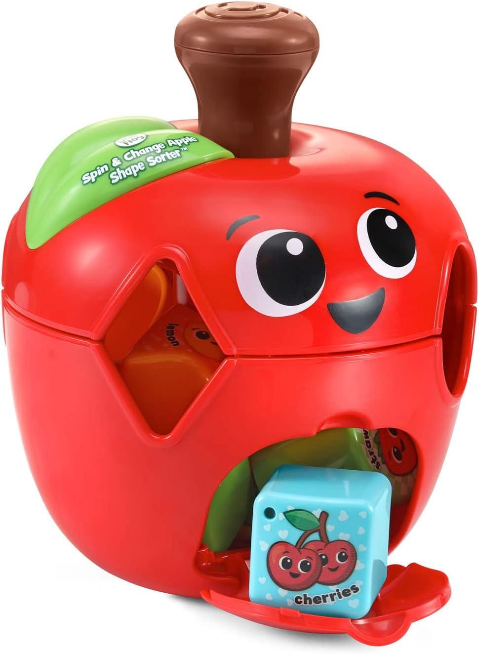 Discovering new shapes is sweet with the Spin and Change Apple Shape Sorter. Press the stem on this a-peeling shape sorter to rotate the apple and create four sorting spaces. Toddlers will love examining the sides, curves and corners of ten simple and complex shapes before pushing them into the sorter. A fruit salad of fun, each colorful block features a friendly character to encourage kids to identify different types of fruit. Open the storage door to quickly release all the blocks and play again. It’s easy as pie! The apple and shape blocks are made with 85% reclaimed plastic which means less waste goes into landfills. Intended for ages 18+ months. Batteries not required.