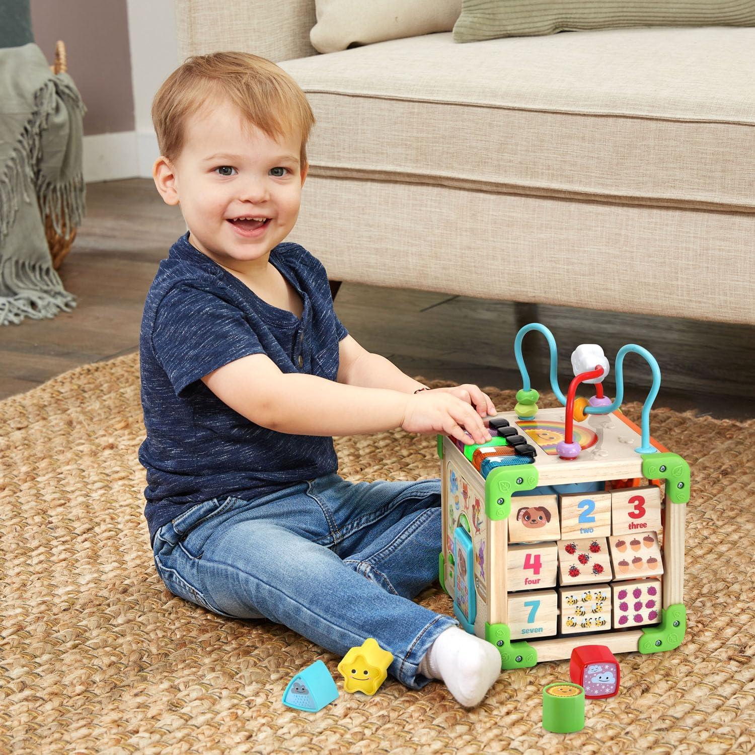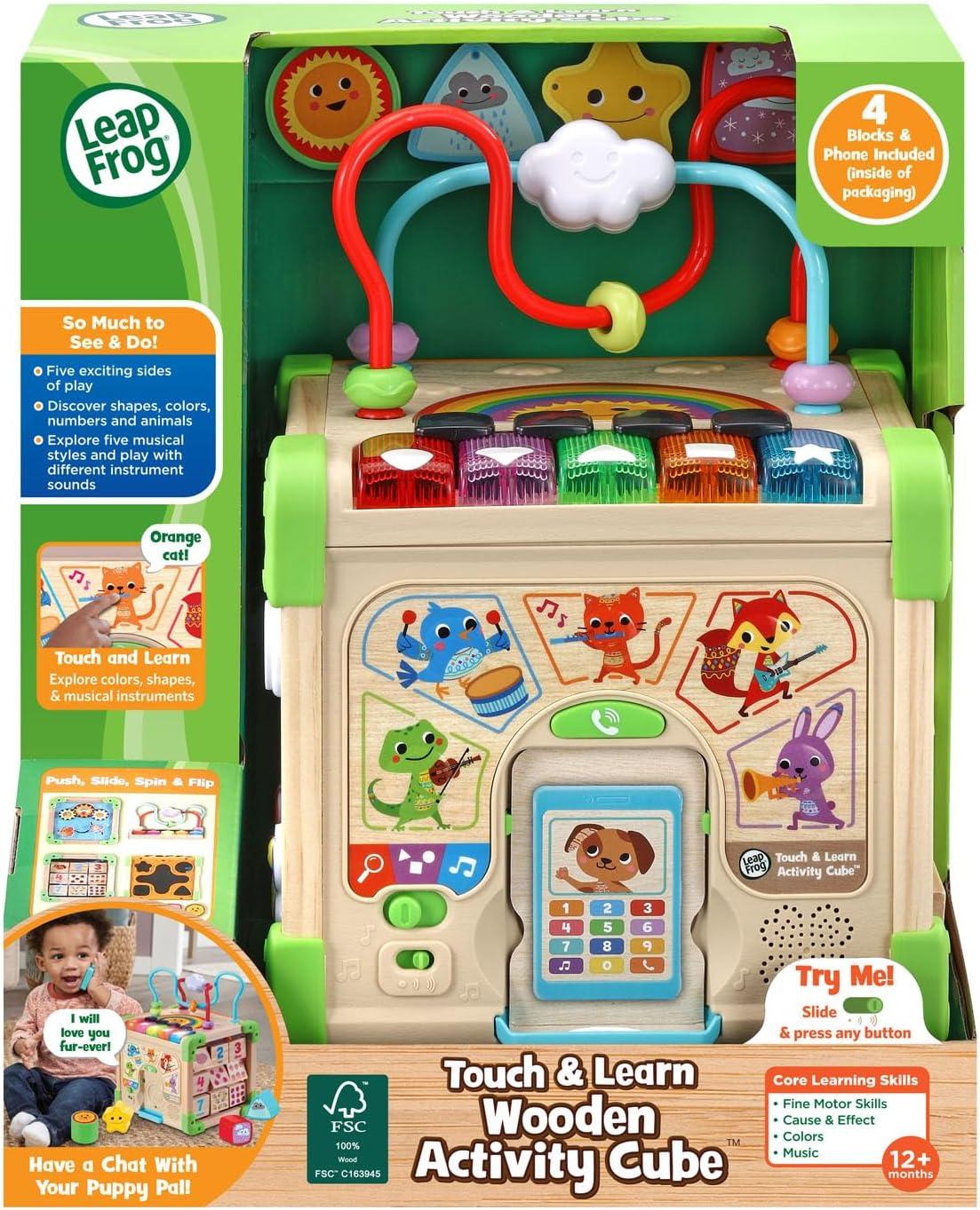 It’s a block party with the Touch and Learn Wooden Activity Cube™. Exciting activities around every corner introduce toddlers to shapes, colors, numbers, animals and music. Touch the five friendly animals to hear them play their instruments, then use the light-up piano keys to make your own music using fiddle, drum, flute, guitar and trumpet sounds. The phone’s ringing! Pick it up to chat with your new puppy pal, Dog. Take a trip to the top of the cube and spin the cloud or slide the beads around the maze to build problem-solving and coordination skills. Can you find a picture of five ladybugs? Find the blocks on the side and flip them to explore numbers and things from nature. Slide to the other side and move the squirrel and butterfly or turn the interlocking gears to see cause and effect at work. The fifth side features a shape sorter to use with the four included shape blocks. This cube is made with 100% FSC™-certified wood that comes from well-managed forests. Intended for ages 12+ months. Requires 2 AA batteries. Batteries included for demo purposes only. New batteries recommended for regular use.